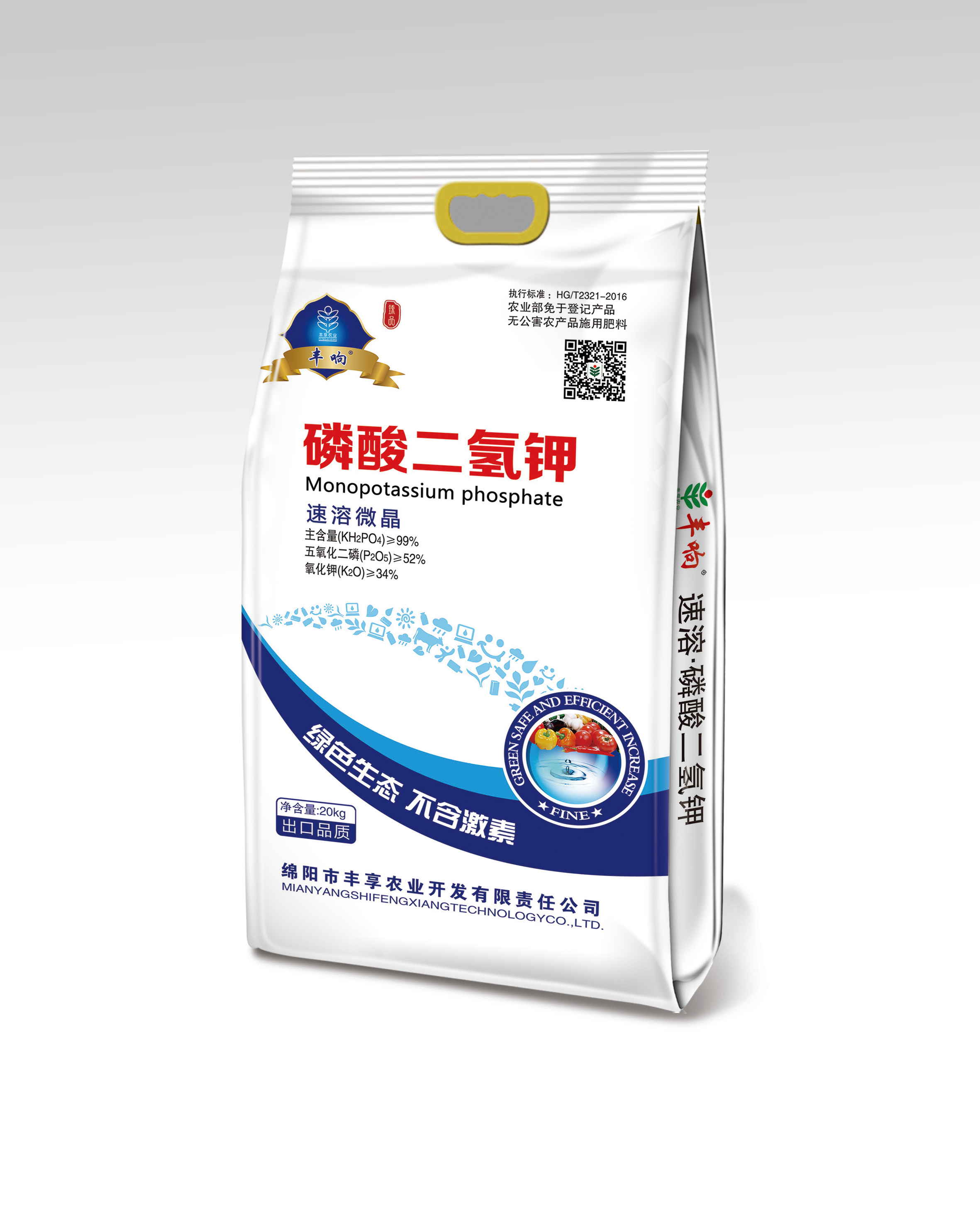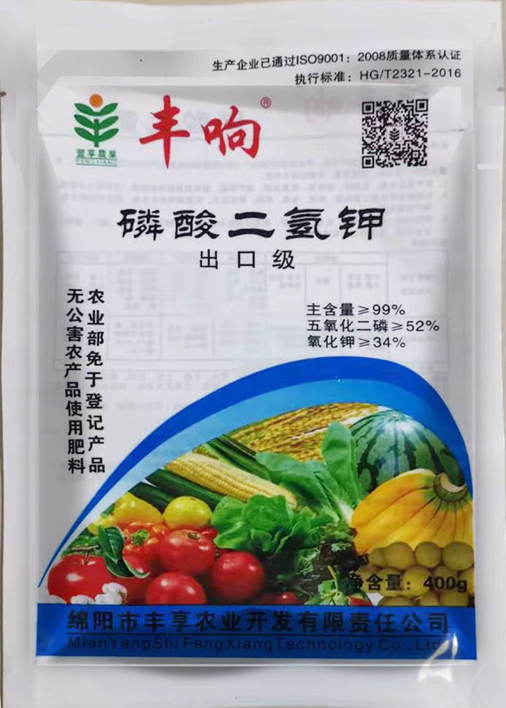 執行標準HG/T2321-2016,豐響熱法99%高品質磷酸二氫鉀。能有效為植物提供速效磷鉀,壯根、狀桿、抗旱、抗寒、抗逆、抗倒伏、促花、保花、保果、改善品質、提高產量。